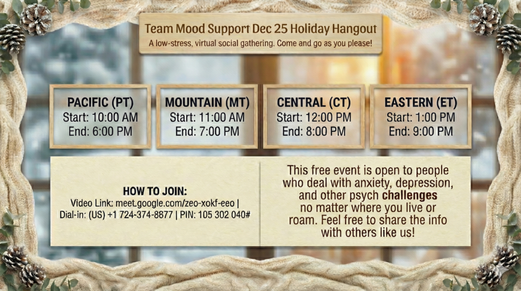 Holidays can be tough! The pressure of family and friend gatherings or the feeling of isolation or boredom can turn these days into a challenge. We have a remedy. Join us for our fun 8-hour virtual hangouts on Thanksgiving and Christmas, where you’re free to come and go as you please. Enjoy friendly company without the need to pretend you’re in a festive mood! Come along and help yourself and others as we navigate these days together!